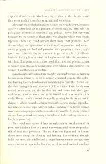 As population density grows regional swiddening ecologies begin to fail simply because the ratio of land to people declines. Fallow periods become shorter as land that has not completely regenerated is again planted. There are two ways out now: one is to increase the local warfare in order to gain control of more land. The other way out is called “agricultural intensification ” meaning that more labor-intensive versions of land management begin to be used. Instead of letting land stay fallow for a decade the process of regeneration can be hastened by bringing manure and compost to the land, by irrigating it, by intensive weeding, and so on. In general human labor is substituted for land area and this new labor input comes from men. Males are dragged back into working to support their families, gaudy warriors turn into dreary peasants, and the life of males is again focused on the domestic household rather than on the men’s house.